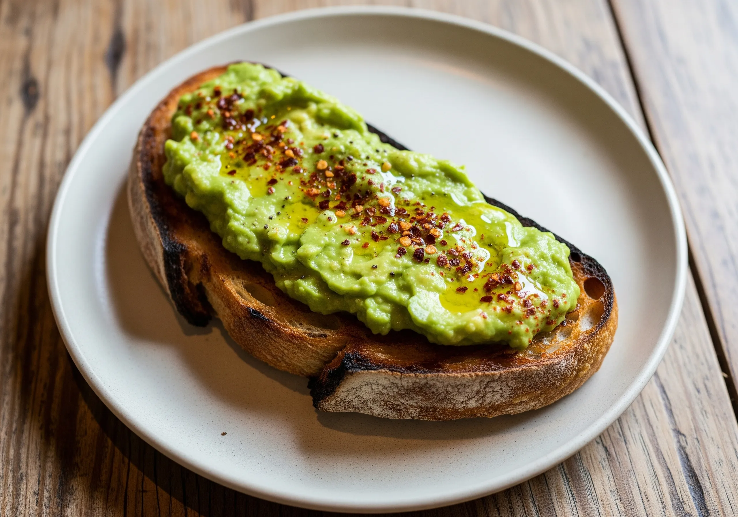 Sourdough topped with smashed avocado, olive oil, and chili flakes.